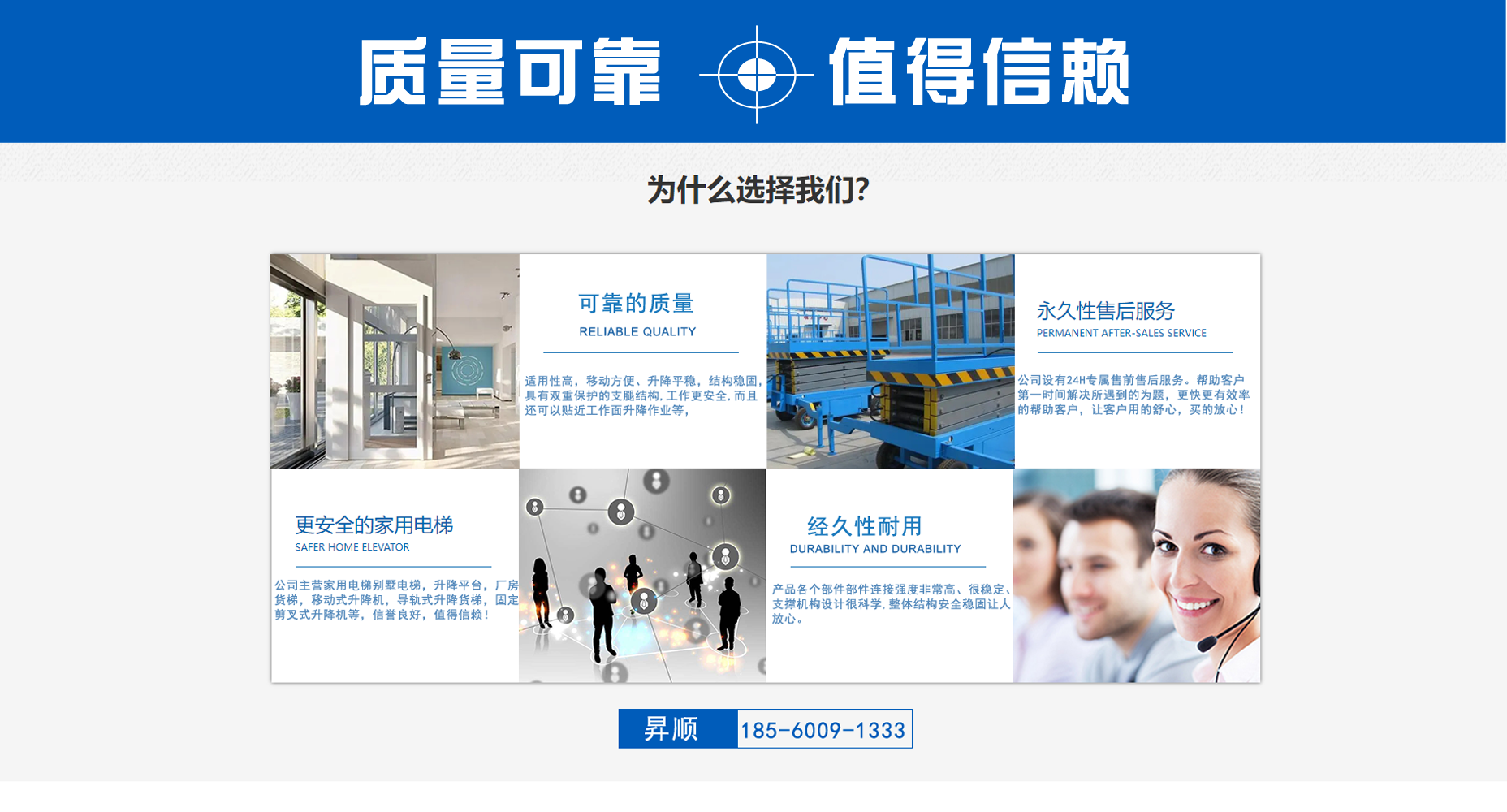 山東昇順液壓升降機械有限公司是一家主營家用電梯,別墅電梯,升降平臺,廠房貨梯,移動式升降機,導軌式升降貨梯,固定剪叉式升降機等產品企業,質量可靠,值得信賴?! ∮脩糁辽?,以用戶為中心”是公司永遠堅持的服務宗旨,贏得用戶的贊許是我們的榮譽,及時滿足用戶的需求,是我們公司的愿望。長期以來,公司員工以優質的服務,取悅于用戶,以誠信的言行取信于用戶,得到了用戶們的好評。我們期待著與您更加愉快的合作!公司的發展,離不開社會的大力支持,在社會的支持和幫助下,我們正昂首闊步邁向未來! 我們的經營方針是:以質量求生存,以產品求發展,以信譽保合作,以服務贏客戶?! ”竟緦Ξa品質量和各項服務恪守合同承諾,并愿與新老客戶精誠合作,共創未來。 公司精神:創新是主題,超越是不懈的追求?! 」咀谥迹盒抛u保證,誠信為本。 我們會以合理的價格,良好的信譽,雄厚的實力,優質的產品,最周到的服務,服務于廣大新老客戶!...